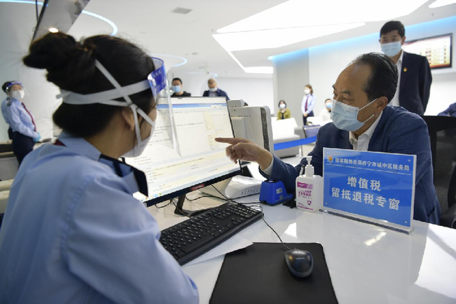 在西宁市城中区办税服务厅,青海通安运输有限公司申报办理一笔3万元的退税,省税务局领导体验流程并为其办理、审批等。该公司人员李金霞表示,企业经营受疫情影响大,退税资金支持很关键,退税款将用于购买燃油等,继续组织好生产活动。