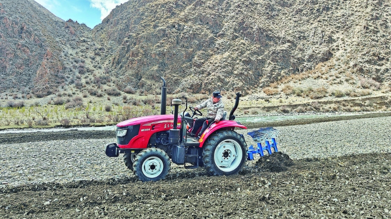 进村时还在飘雪的结拉村,下午放晴了。跟随驻村工作队的脚步,我们来到结拉村的春耕现场,三辆拖拉机正在有序犁地,已经犁过的地里,大家在有序地撒种。“群里说今天开始春耕了,我正好有时间就过来了,我们三四个人轮流开,今天得犁30多亩地。”说着话,闹布达杰的同伴接过了他的车继续作业。“村子里的青壮年基本都会开,谁有时间谁就过来。种地时,大家都不会偷懒,四五天时间,村子里的1500多亩地也就种完了。”闹布达杰说。