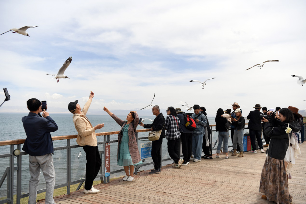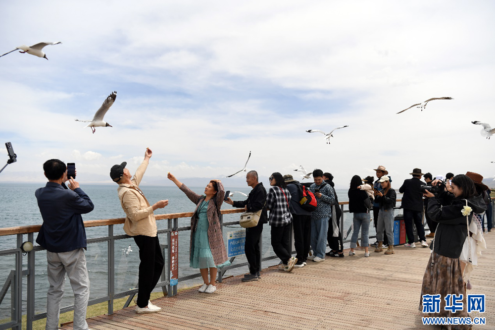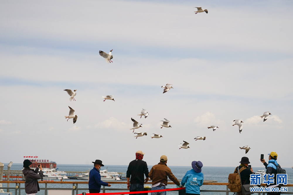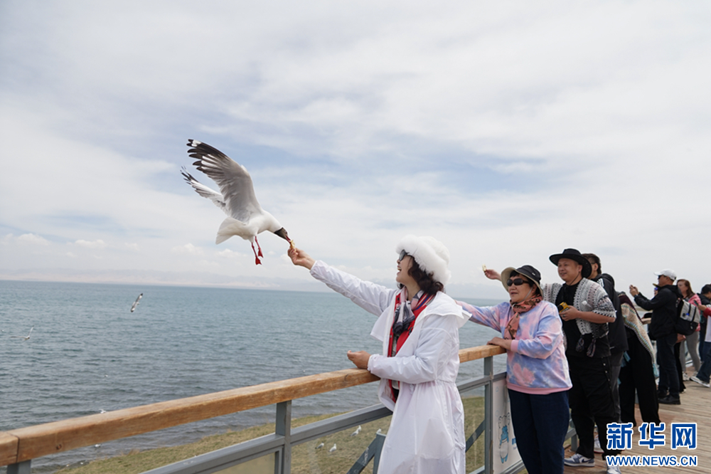 5月15日,游客在青海湖二郎剑景区给鸟儿喂食。新华网 鱼昊 摄