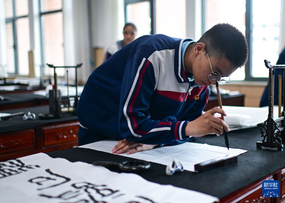 6月18日,果洛西宁民族中学学生在上书法课。新华社记者 张龙 摄