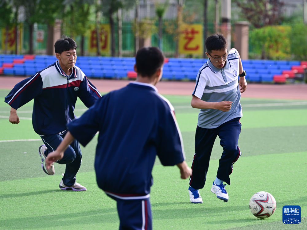 6月18日,果洛西宁民族中学学生在踢球。新华社记者 张龙 摄
