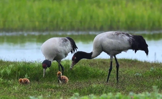 近日,在青海省海北藏族自治州刚察县境内,摄影爱好者在青海湖畔拍摄到了国家一级保护动物黑颈鹤活动的影像。黑颈鹤迈着悠闲的步伐漫步在湿地中,带领幼崽玩耍觅食,为夏日的青海湖增添了一份灵动与生机。