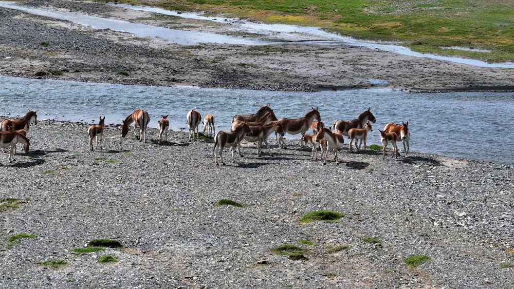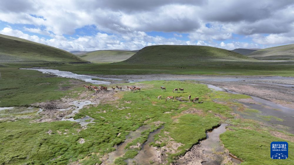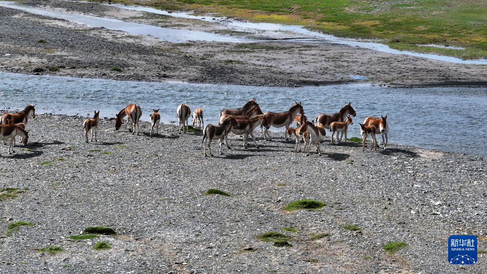 8月9日在青海省玉树藏族自治州曲麻莱县境内拍摄的藏野驴(无人机照片)。新华社发(昂江摄)