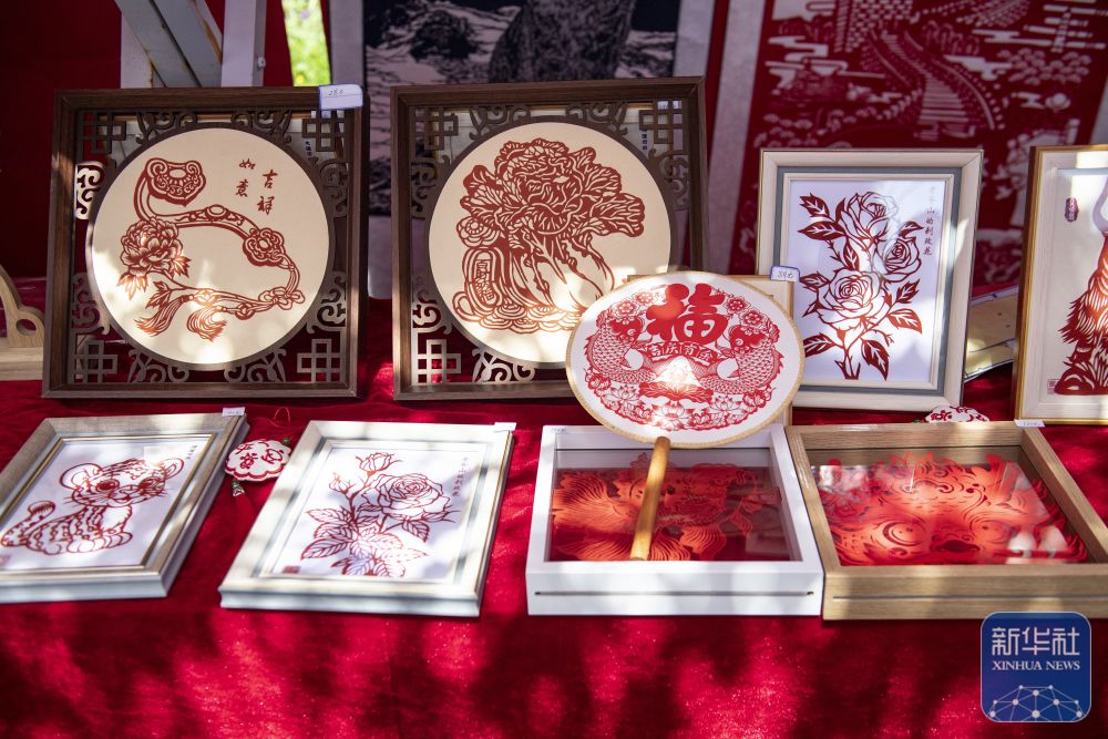 ↑这是7月22日在大通县边麻沟花海景区拍摄的手工艺人制作的剪纸作品。