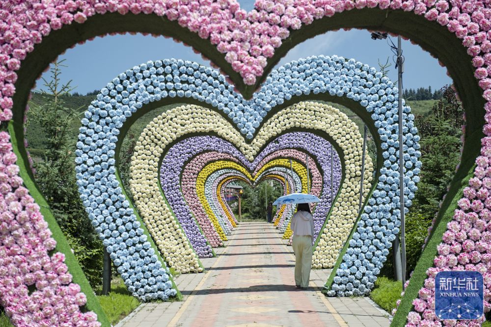 ↑7月22日,在大通县边麻沟花海景区,一名游客经过鲜花长廊。