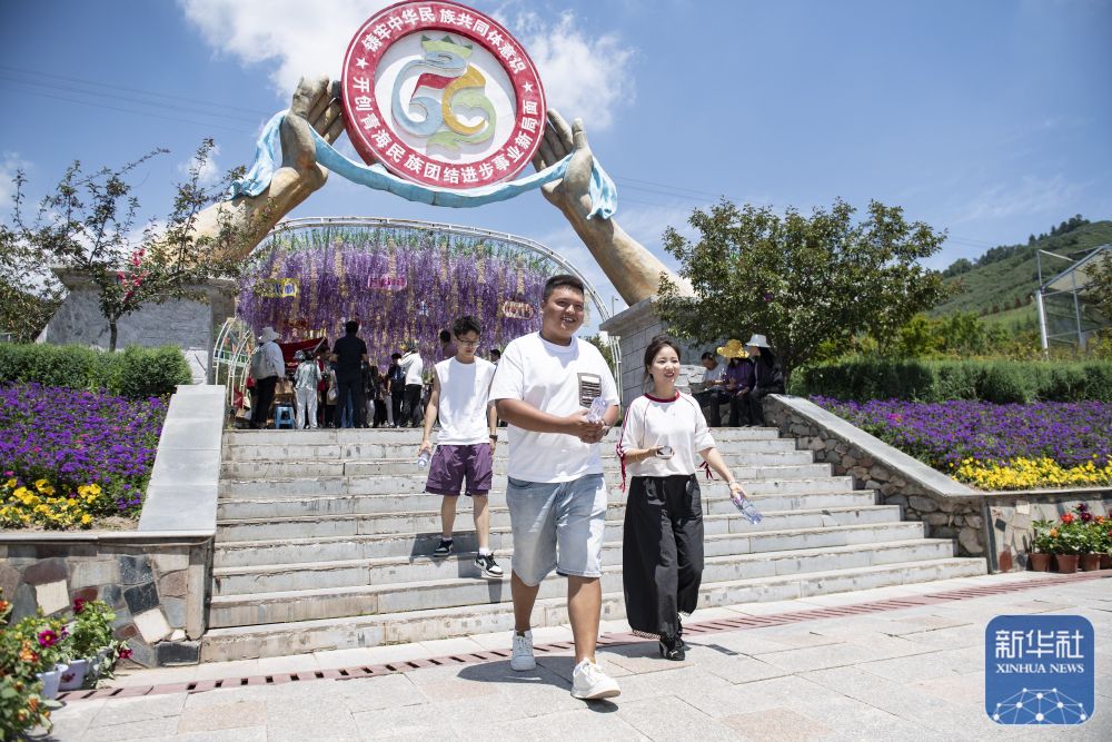 ↑7月22日,游客在大通县边麻沟花海景区游览。