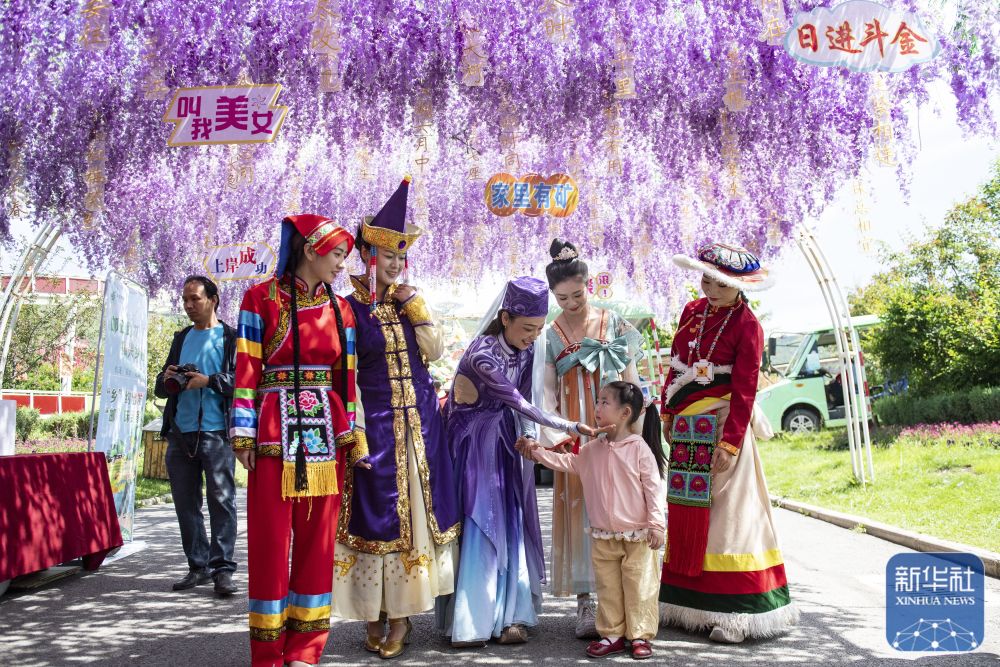 ↑7月22日,在大通县边麻沟花海景区,工作人员与一名同家人来游玩的小朋友互动。