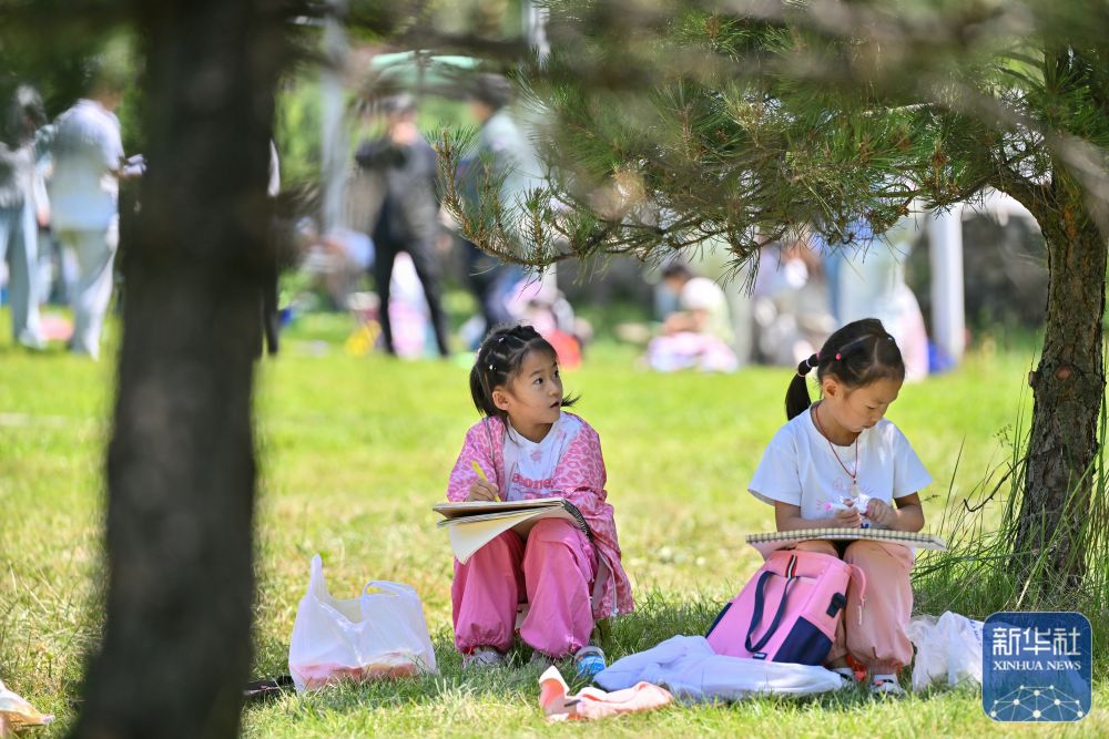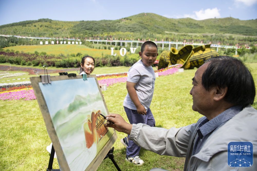 ↑7月22日,两名小学生在大通县边麻沟花海景区内参加暑期美术写生研学活动。