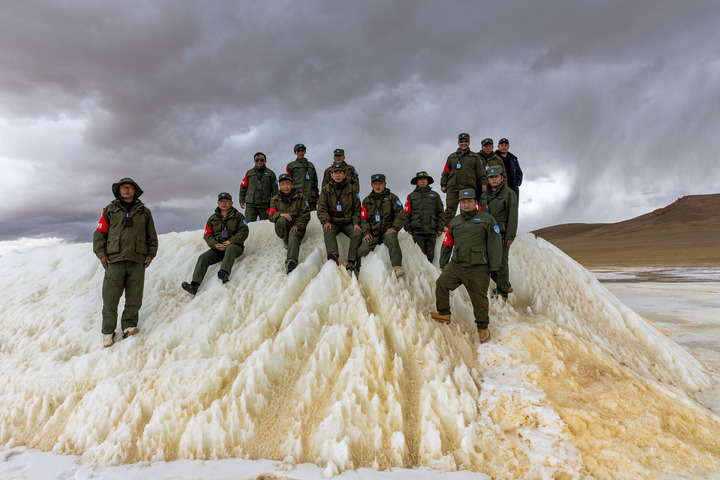 野生动物专业管护员在巡护路上一处垭口的冰雪堆上合影(2024年5月7日摄)。新华社记者 姜帆 摄
