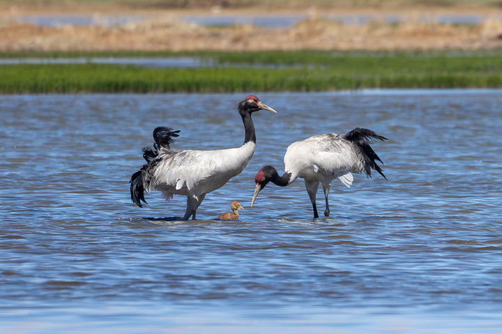 2024年6月9日,一对黑颈鹤带着雏鸟在西藏那曲市申扎县一处湿地栖息、觅食。新华社记者 旦增尼玛曲珠 摄