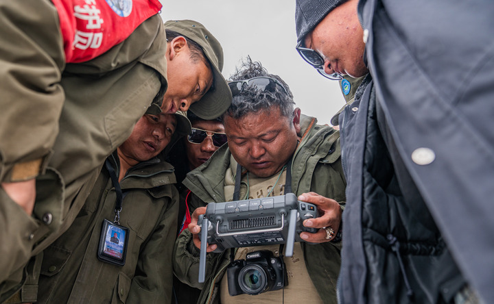 罗布玉杰管护站站长格桑伦珠(右二)和队员们在大雪中操作无人机观察藏羚羊迁徙情况(2024年5月10日摄)。新华社记者 丁增尼达 摄