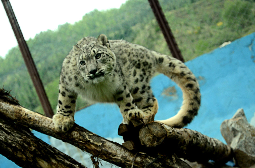雪豹在西宁野生动物园雪豹馆的木头上玩耍