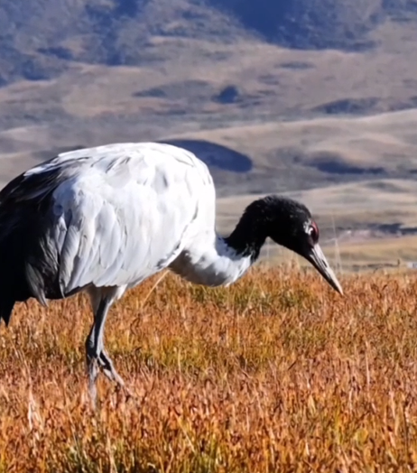 金秋时节,青海省海北藏族自治州祁连县的草原壮美如画。草甸泛黄,似金色的地毯铺向远方,与巍峨的雪山相互映衬,黑颈鹤一家在草甸上悠然觅食。