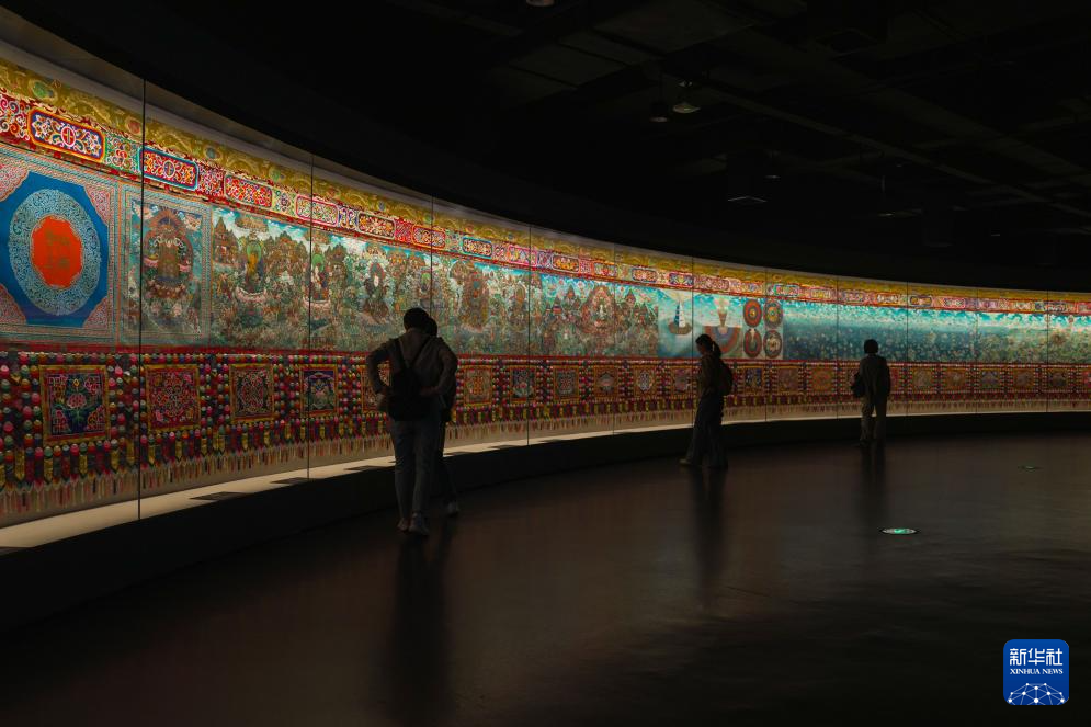 沿着展厅缓缓前行,最令人震撼的莫过于《中国藏族文化艺术彩绘大观》。讲解员温得兄停在一幅描绘神话传说的画面前介绍:“这幅作品由青、藏、甘、川、滇五省区400位唐卡画师共同完成,仅上卷创作就历时27年。”今年4月,全长410米的彩绘大观下卷布展完成,目前正在博物馆北馆特展展出。