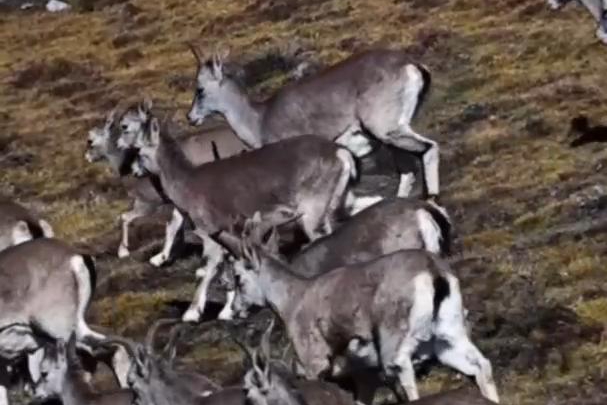 近日,青海省海北藏族自治州海晏县包呼图山出现上百只岩羊。它们跳跃奔跑,和山脉形成一幅静中有动、动中有静的灵动画面。岩羊是国家二级保护动物,因擅长在悬崖上自由行走,也被称为岩壁上的“精灵”。