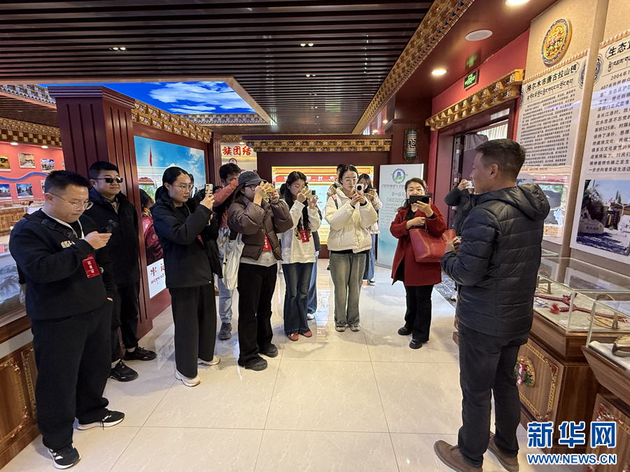 采访团在长江源村村史馆参观。新华网 鱼昊 摄