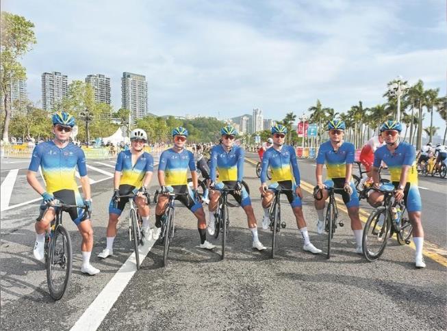 青海省男子公路自行车队赛前合影。王宥力 摄