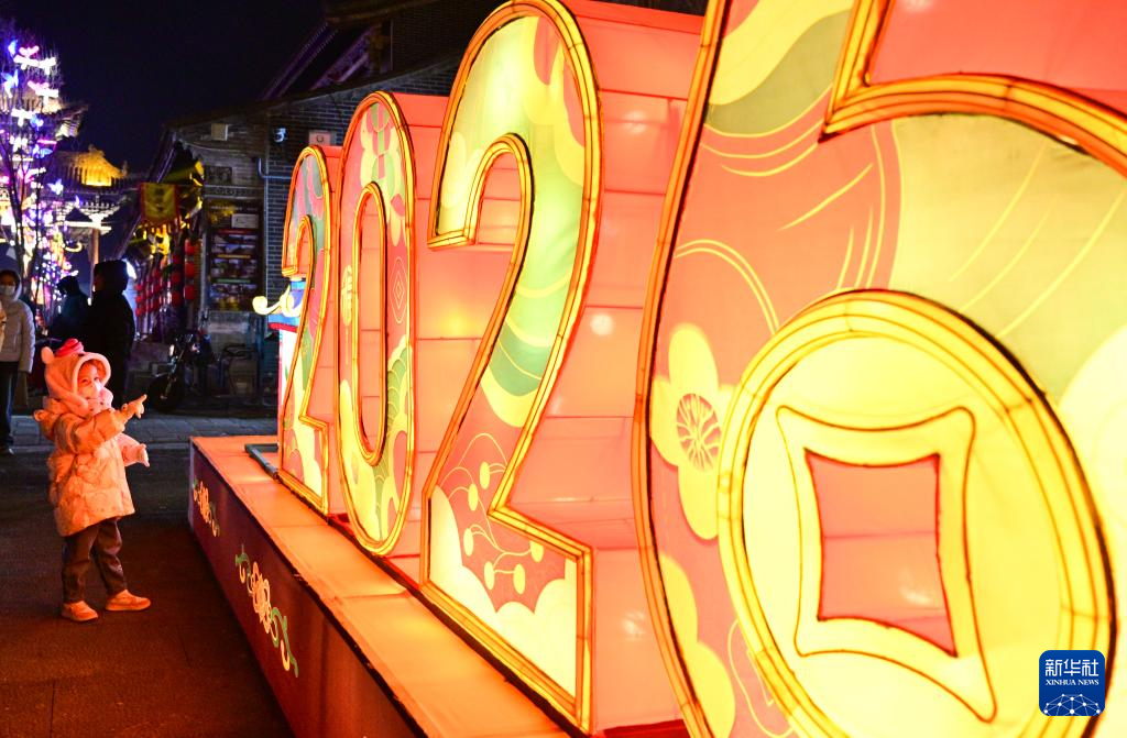 1月2日,一名小朋友在青海省西宁市湟源县丹噶尔古城观看灯组。新华社记者 齐芷玥 摄