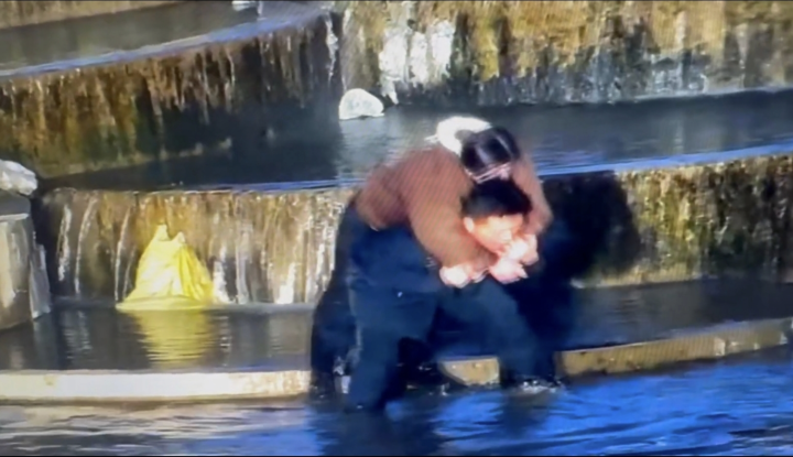 背着人在冰面湿滑的河道里行走格外吃力,走了一段路后,索南才让脚下一滑,摔了一跤。他下意识扶住背上的女子,随后站起身,忍着膝盖的疼痛继续快步往岸边走,他心里只想着快点把人送到安全地带。索南才让将女子背到岸边,早已在岸边等候的救援人员立刻上前接应,将女子紧急送往医院。