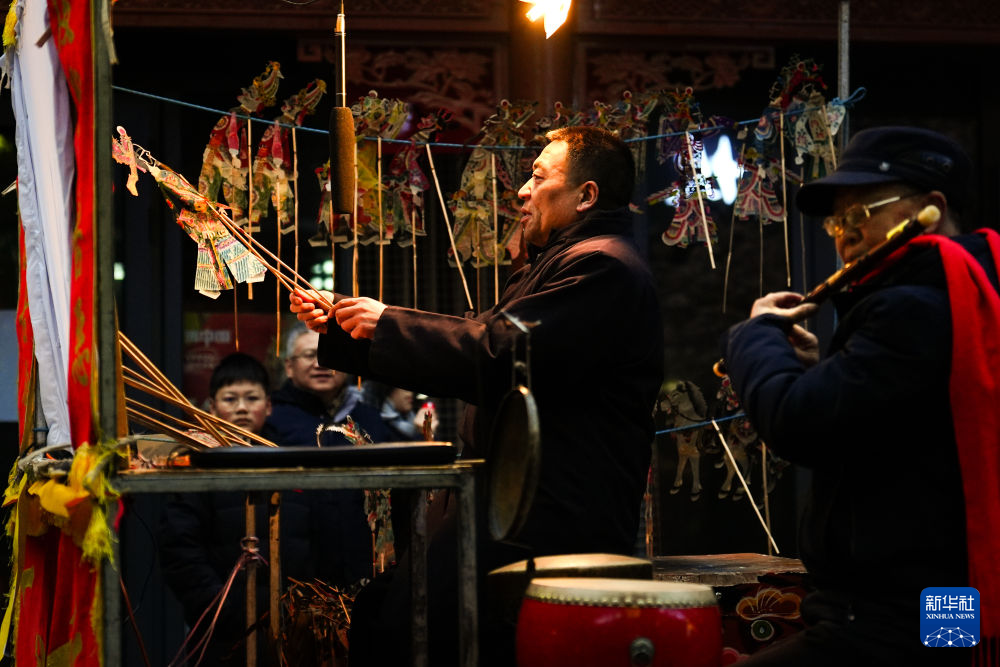 1月25日,观众在青海省西宁市城北区观看周邦辉(中)表演皮影戏。新华社记者 齐芷玥 摄