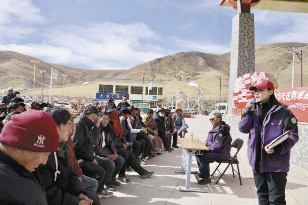 热闹的气氛里,宣讲正式拉开帷幕。玉树州融媒体中心宣讲员才仁久丁先用藏语向大家问好,随后驻村工作队队长、州融媒体中心记者求永才藏走上前,和宣讲员一同围绕中央一号文件精神,结合查德村实际,从产业发展和美丽乡村建设两大方面,把“书面语”变成牧民听得懂的“家常话”。