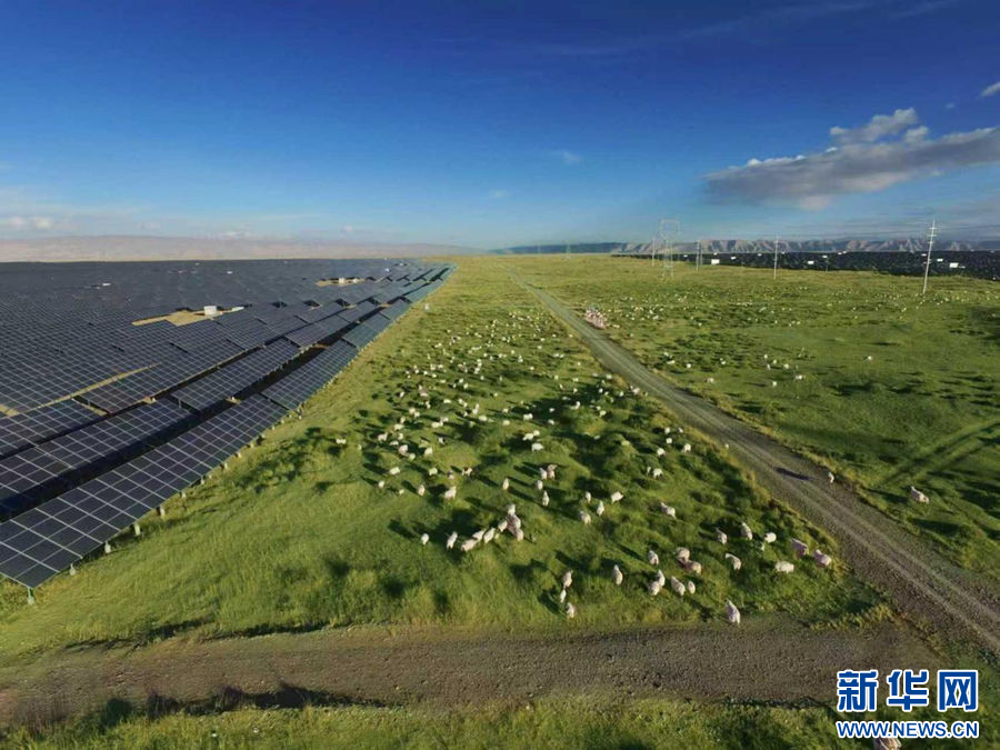 羊群在共和县塔拉滩的光伏电站内活动(资料照片)。