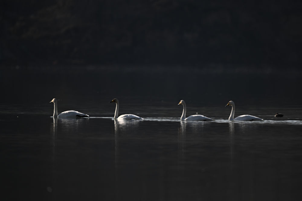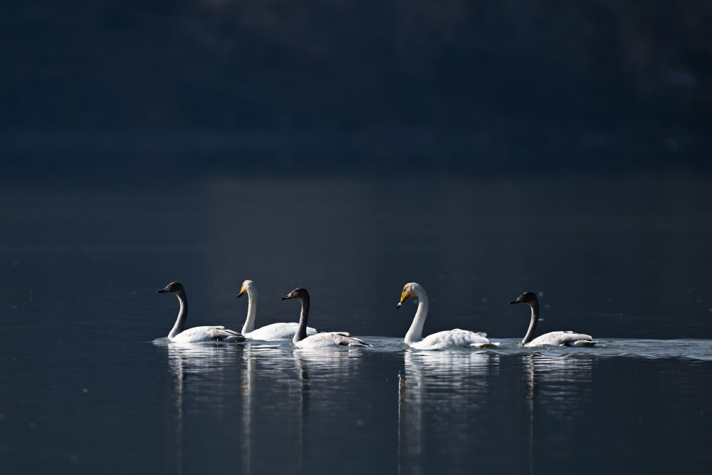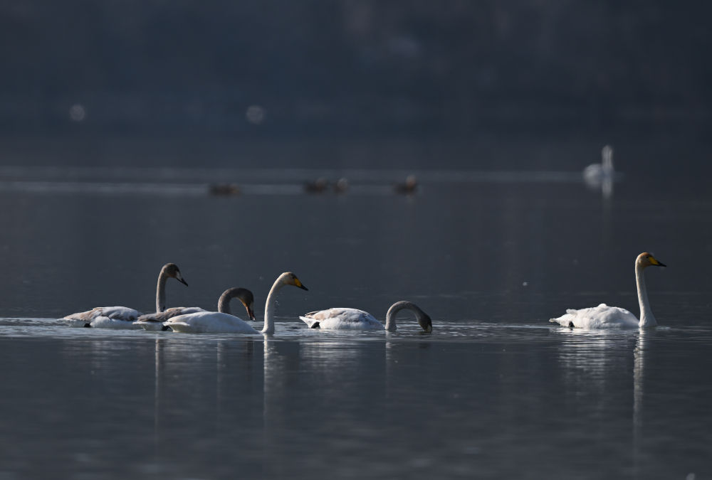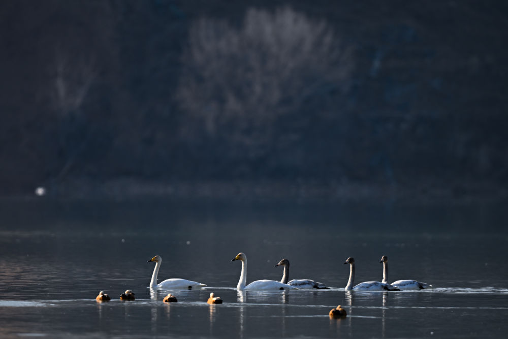 11月30日,天鹅在青海省海东市化隆回族自治县群科镇境内的黄河上游弋。新华社记者 张龙 摄