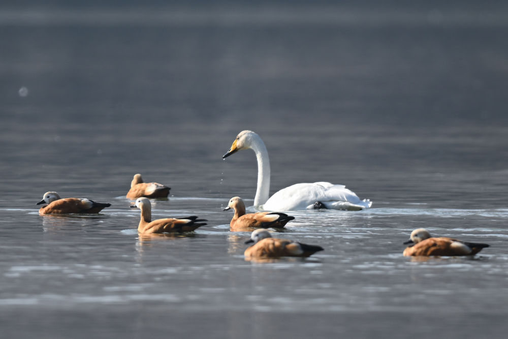 11月30日,天鹅与赤麻鸭在青海省海东市化隆回族自治县群科镇境内的黄河上游弋。新华社记者 张龙 摄