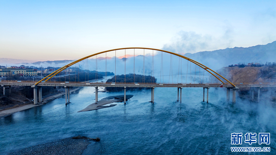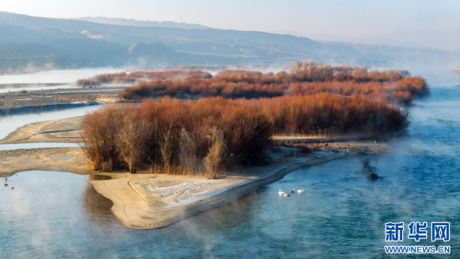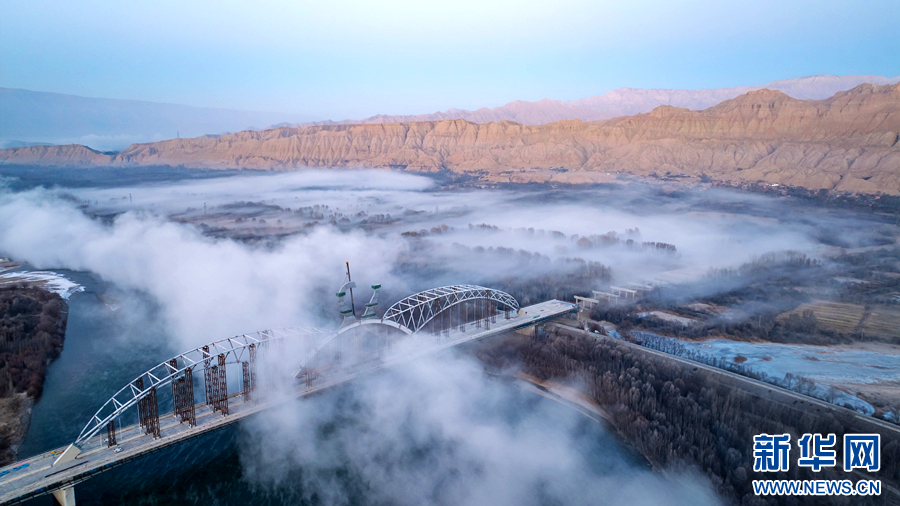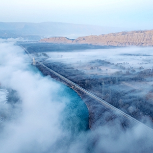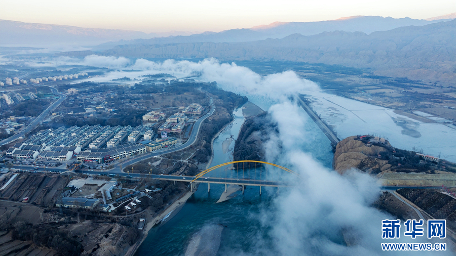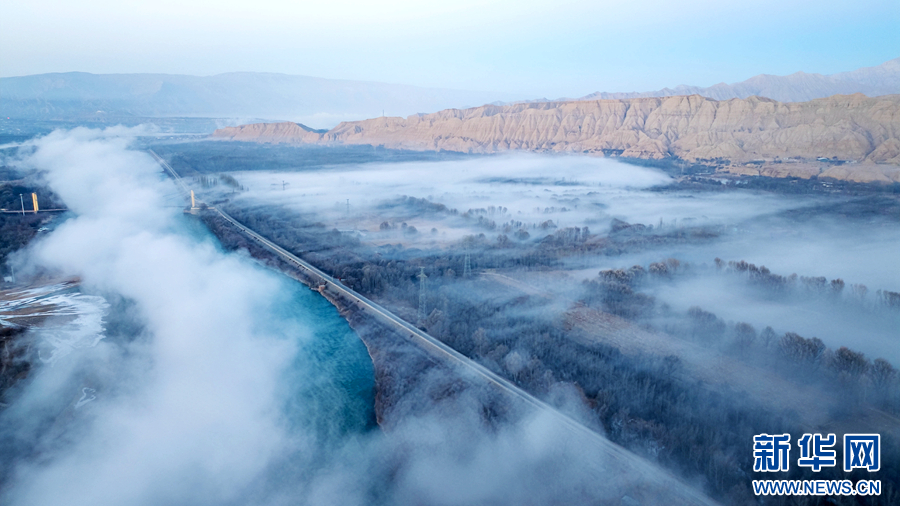冬日清晨,青海省海南藏族自治州贵德县黄河两岸云雾缭绕,在朝阳映衬下,连绵不断的丹霞山、清澈碧绿的黄河水在云雾中若隐若现,宛如仙境。