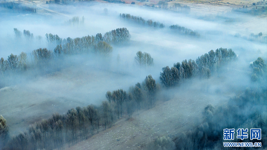 一缕缕薄雾在林间环绕,如梦如幻。新华网发(宋忠勇 摄)