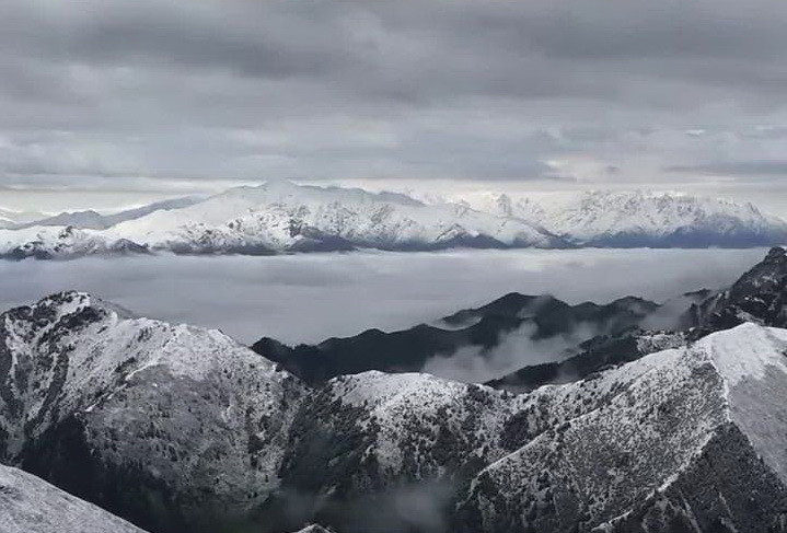 盛夏时节,青海省海北藏族自治州祁连县迎来降雪。山野悄然换上银白“冬装”。云雾缭绕间,巍峨的阿咪东索雪山半遮半掩,四周群山青黑色山体与皑皑白雪交织成一幅盛夏“水墨画”。