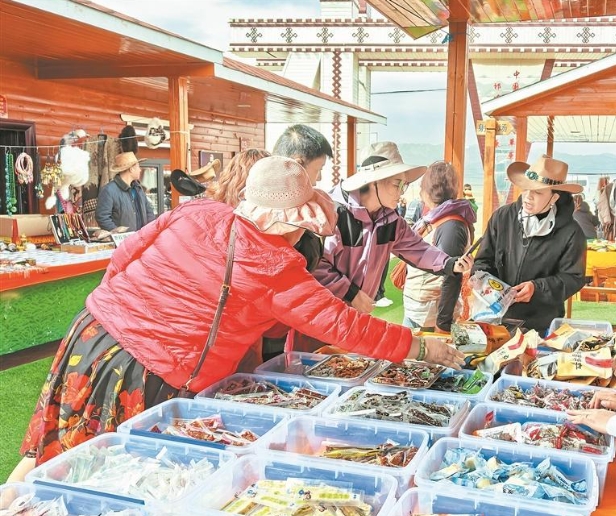 在祁华锦秀峨堡古城驿站内游客在挑选牦牛肉干。记者 丁玉梅 摄
