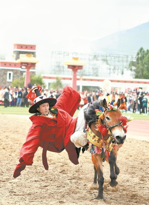 有的骑手身穿轻装,紧握马具肚带,肩靠马脖,下肢朝天,在驰骋的马背上稳稳倒立。有的在奔驰的骏马上,用脚尖紧钩马镫,全身仰面悬挂于坐骑侧面,头部几乎接近地面,场面极为惊险刺激,这些险象环生的技艺给看台上的观众增添了不少乐趣。来自省城西宁的摄影爱好者李军说:“赛马会全方位展示了玉树社会、经济、文化的繁荣发展,让大家感知到康巴文化在当代的活态传承,确实被惊艳到了,非常震撼。”