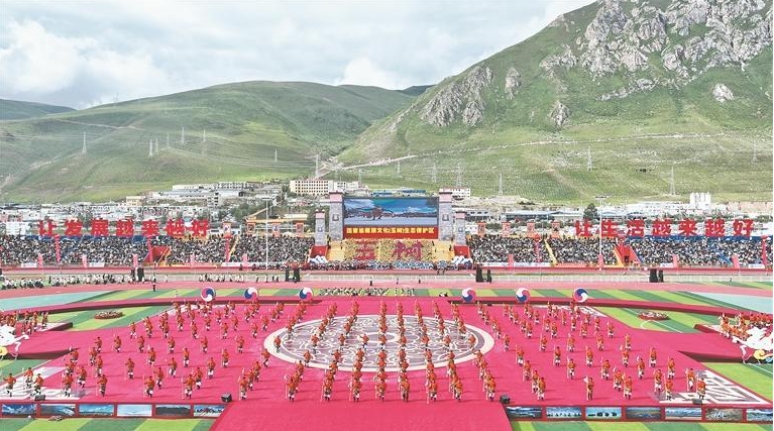 紧接着,一场汹涌澎湃的文化浪潮浩荡袭来。今年赛马会开幕式的演出环节以绿草牧歌、沃野耕耘、薪火相传、盛世花开四个篇章组成,将玉树特有的美韵丽调,盛大的传统歌舞、马术表演与独特的民俗活动完美交织成一幅生动的文化图景。舞蹈《牧童舞》《背篼舞》再现了游牧人马背上的迁徙生活。《打墙舞》《收割舞》重温了藏族儿女从逐水草而居到筑土为家,从马背游牧到深耕沃野的历史岁月。还有既歌且舞的“伊”,欢快流畅的旋律、抒情优美的舞姿,不断变化的队形,既是藏民族在艺术中自我精神的体现,也是当代舞蹈艺术中不可多得的瑰宝。以鼓点伴奏,踏节而舞的“热巴”一开场,便以平转、串身翻、耍鼓等各种高难度的舞蹈动作征服了观众,来自中央民族大学舞蹈学院的关却扎西说:“这次赛马会上舞蹈的编排在沿袭传统的基础上作了大量创新,内容精彩而震撼,不愧为中国藏族舞蹈之乡,让更多的人因为歌舞记住玉树的美,缔结玉树的情。”