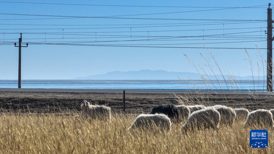 哈尔盖信号工区附近,青海湖、羊群、铁路轨道同框。