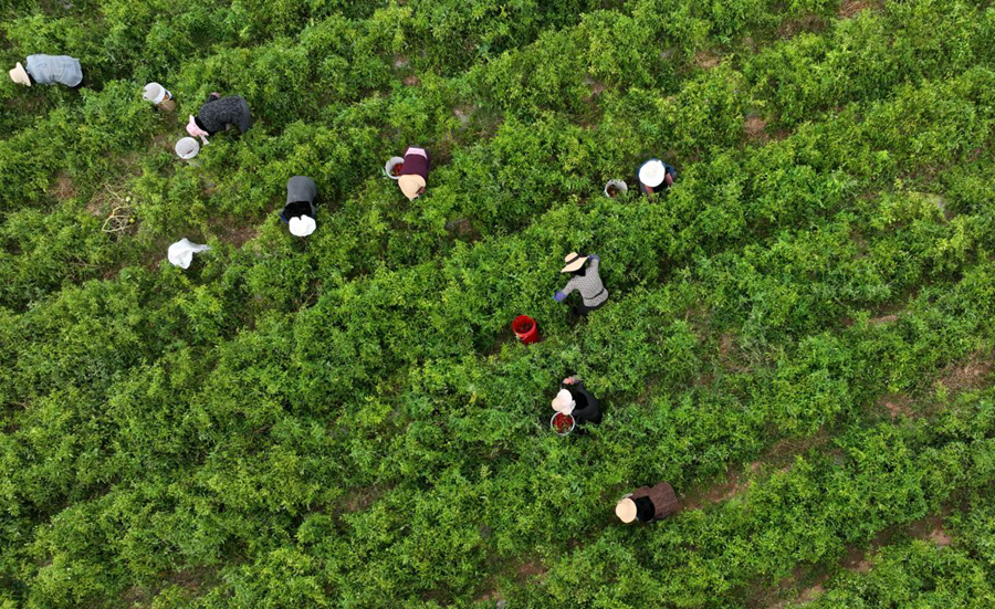 2025年9月11日,在青海省海东市循化撒拉族自治县清水乡下滩村,当地群众在采摘线辣椒(无人机照片)。新华社记者 周盛盛 摄