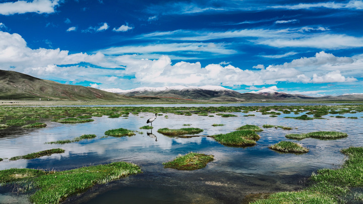 青海隆宝国家级自然保护区内悠闲散步的黑颈鹤。